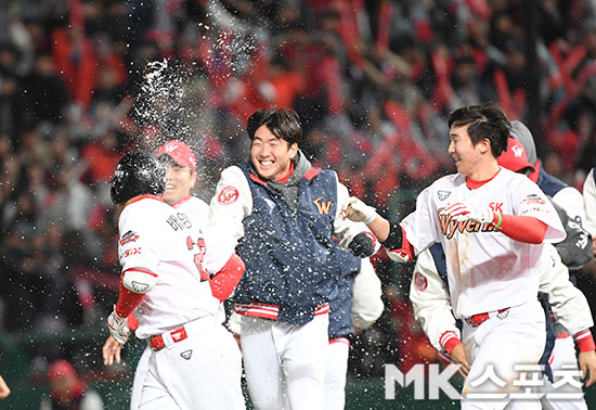 1-1로 팽팽히 맞선 9회말 무사 만루에서 SK 배영섭이 2-1로 역전승을 거두는 끝내기 희생타를 치고 동료들로 부터 물세례를 받고 있다.