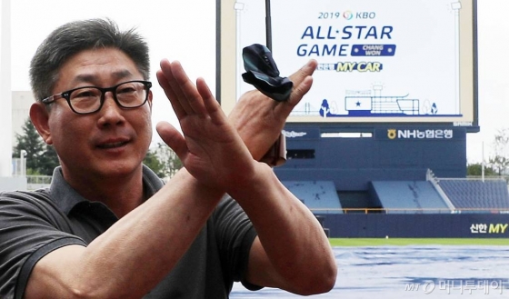 | 【창원=뉴시스】홍효식 기자 = 태풍 '다나스'는 소멸했지만 창원 등 경남지역에 호우주의보가 발효중인 20일 오후 경남 창원시 마산회원구 창원NC파크에서 2019 프로야구 올스타전이 예정된 가운데 한대화 한국야구위원회 위원이 금일 올스타전 취소를 알리고 있다. 한편, 이날 올스타전은 우천으로 인해 내일로 연기됐다. 2019.07.20. yesphoto@newsis.com |