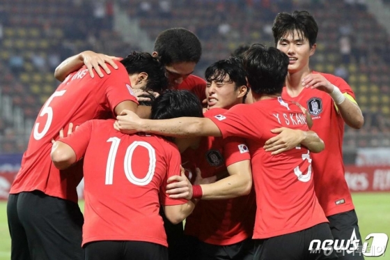 | (방콕(태국)=뉴스1) 민경석 기자 = 대한민국 U-23 대표팀 이동경이 22일 오후(현지시간) 태국 방콕 탐마삿 스타디움에서 열린 '2020 아시아축구연맹(AFC) U-23 챔피언십' 호주와의 4강전에서 추가득점에 성공하자 선수들이 기쁨을 나누고 있다. 대한민국은 이날 호주를 상대로 2:0 승리를 거둬 결승전 승패와 상관 없이 도쿄올림픽 본선 진출을 확정 지었다. 1988년 서울올림픽을 시작으로 2016년 리우올림픽까지 8회 연속 본선 무대를 밟으며 세계 최다 기록을 보유한 대한민국 남자 축구대표팀은 이날 승리로 9회 연속 올림픽 본선 진출을 확정지으며 갖고 있던 세계 최다 기록을 스스로 갈아치웠다. 대표팀은 오는 26일 우즈베키스탄을 꺾고 결승에 오른 사우디아라비아를 상대로 이 대회 첫 우승에 도전한다.2020.1.23/뉴스1 <저작권자 © 뉴스1코리아, 무단전재 및 재배포 금지> |
